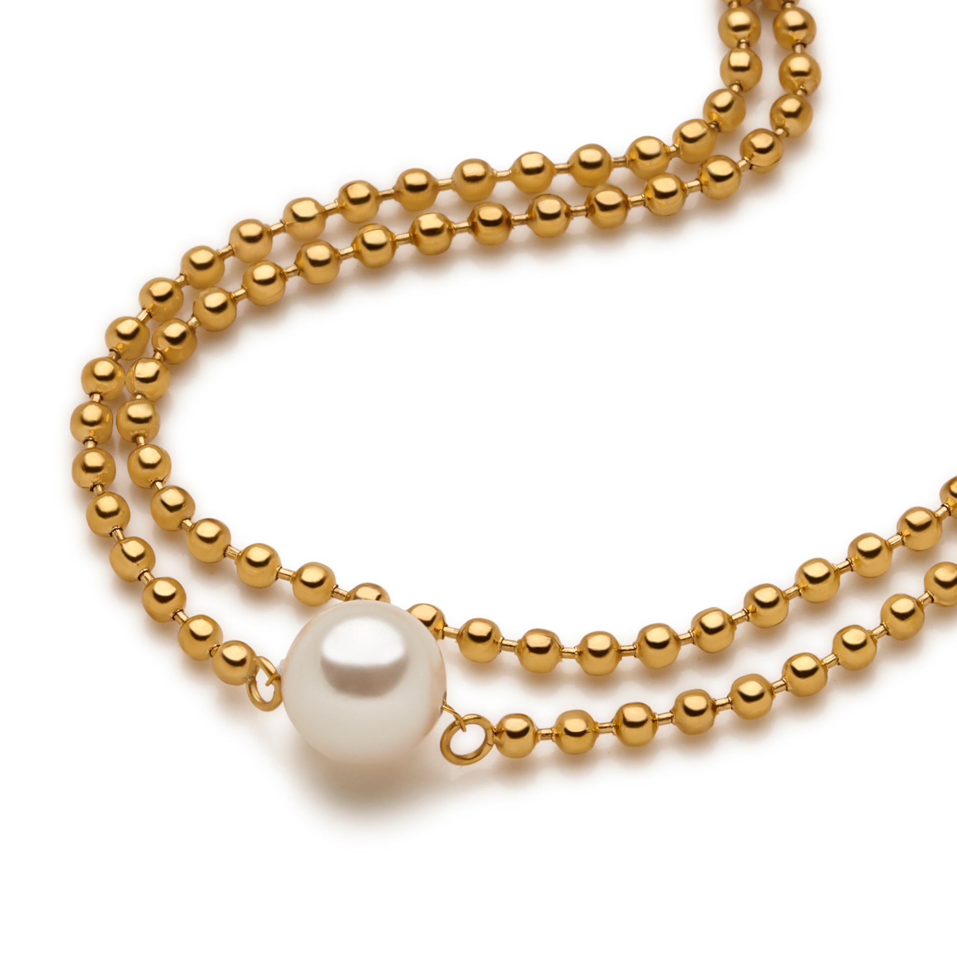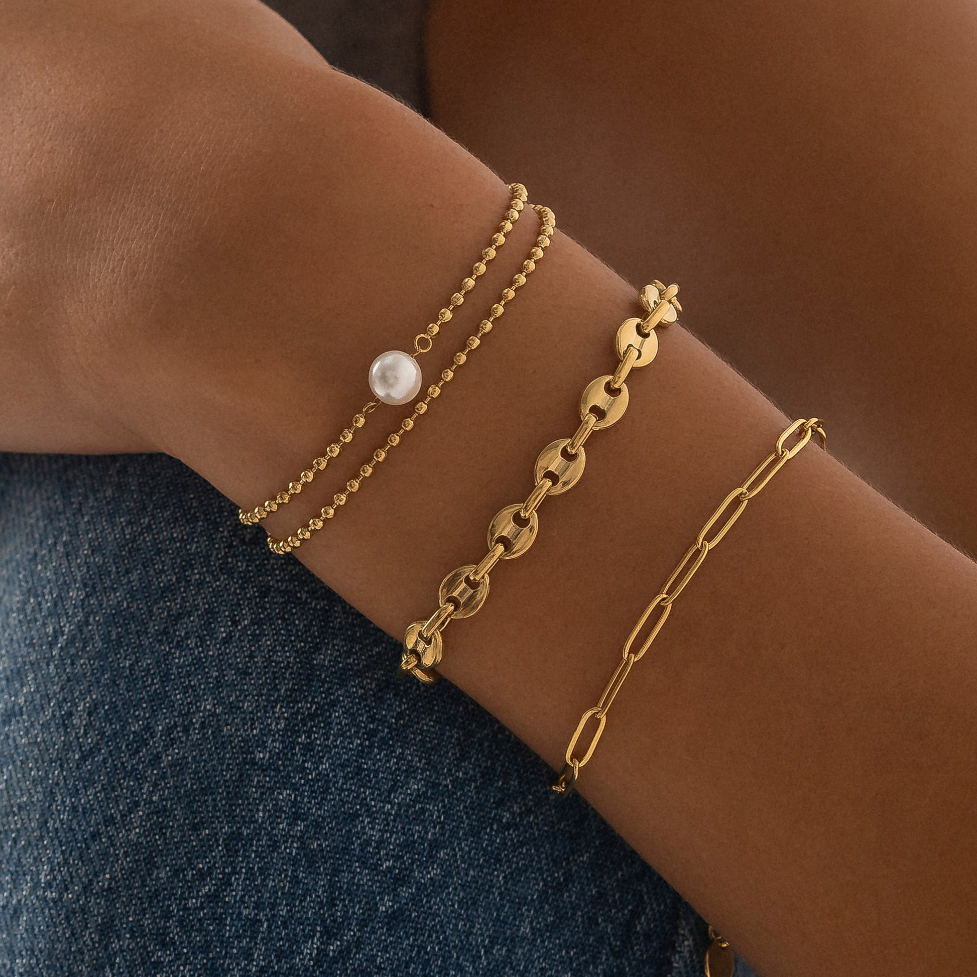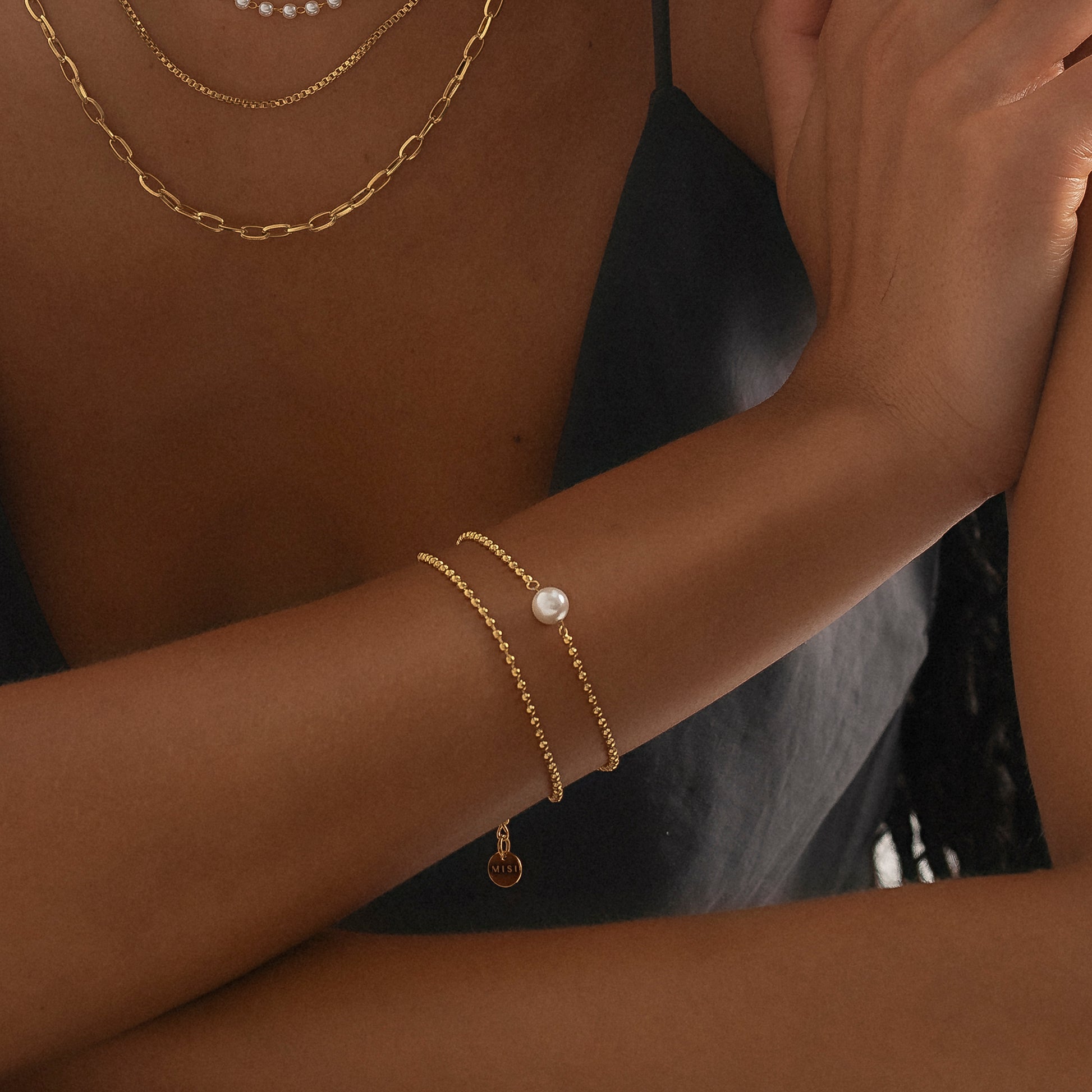 This 14k gold plated stainless steel ball bracelet features a modern double-strand design that balances elegance and edge. One strand showcases sleek gold-toned beads, while the other highlights a single white faux pearl at its center, adding a touch of softness and sophistication.