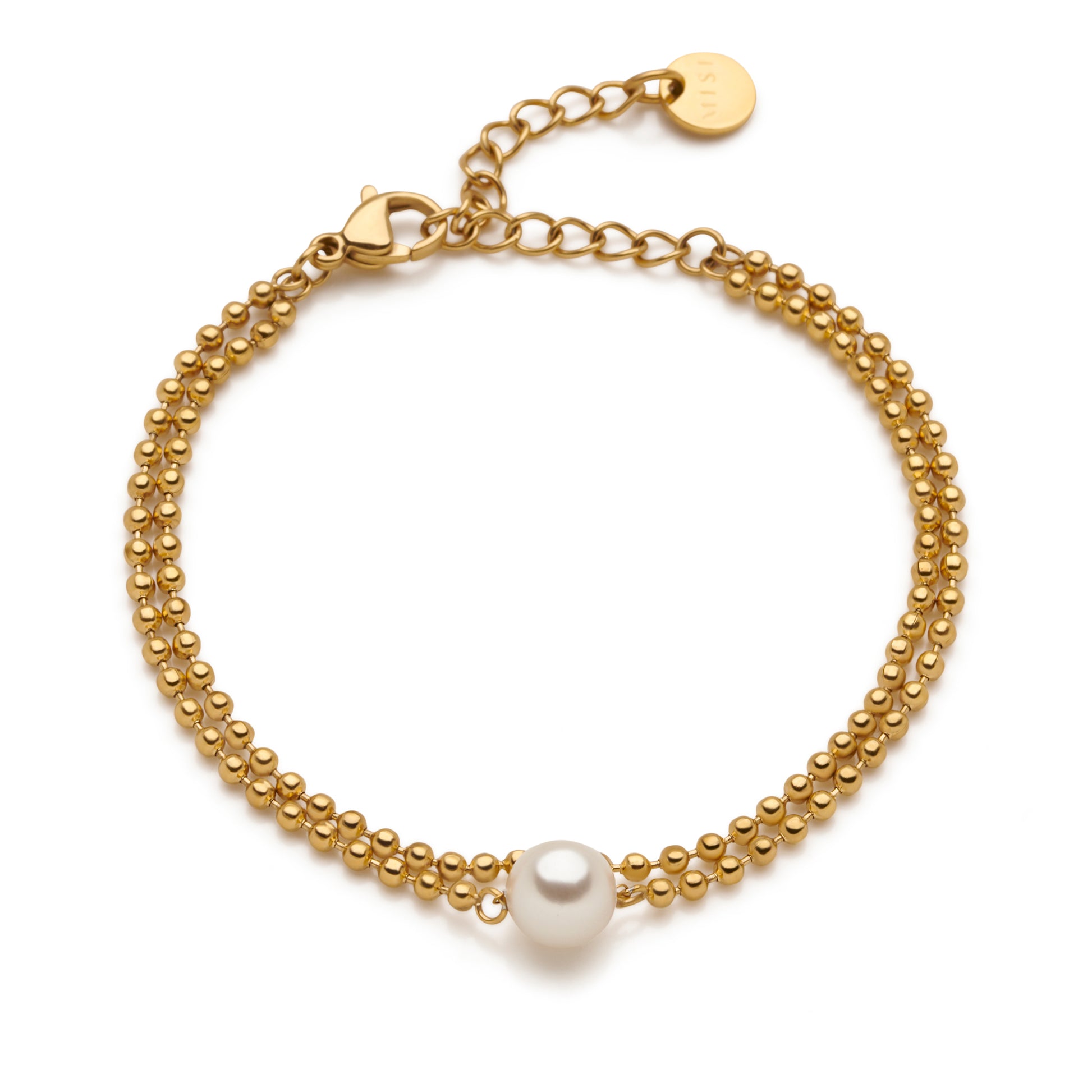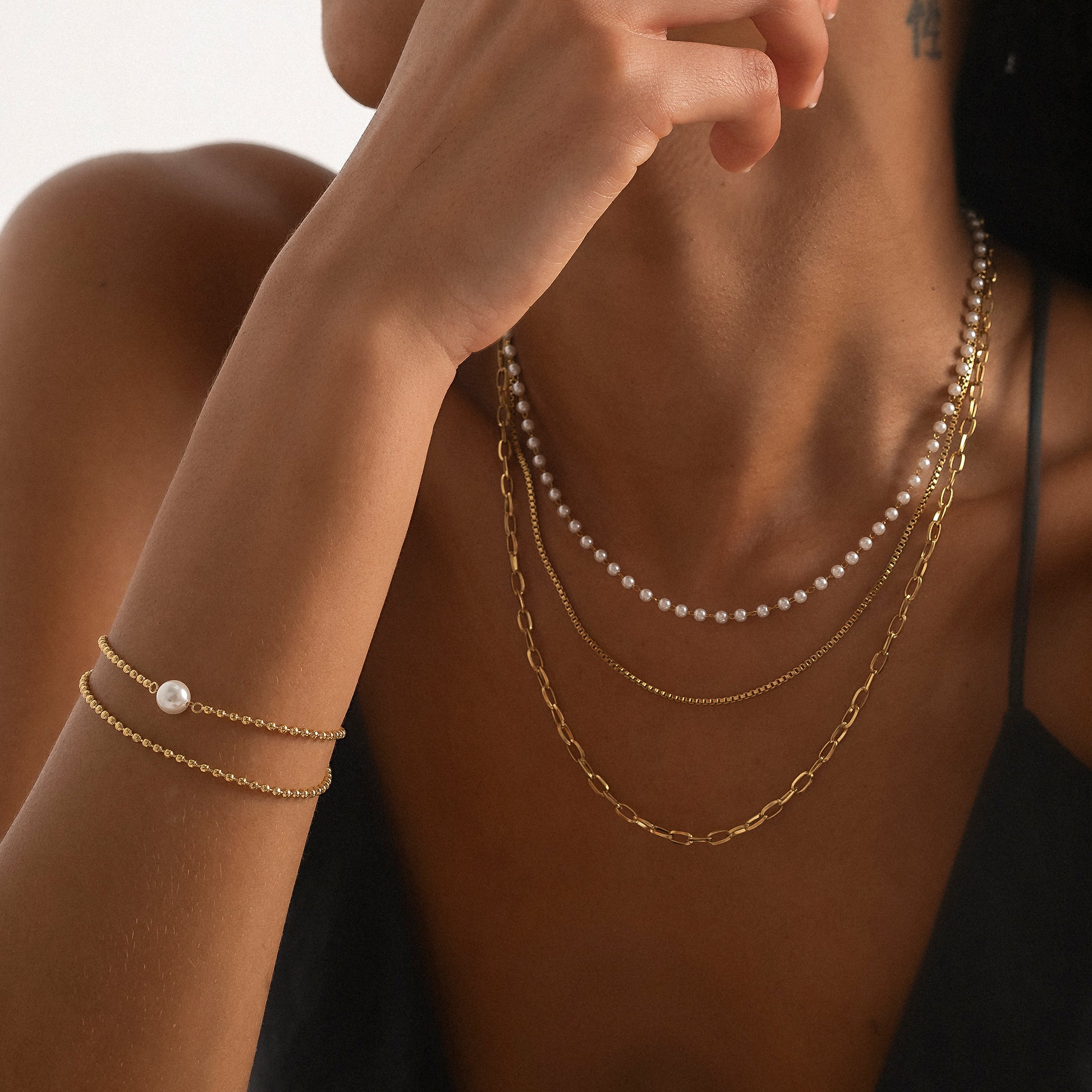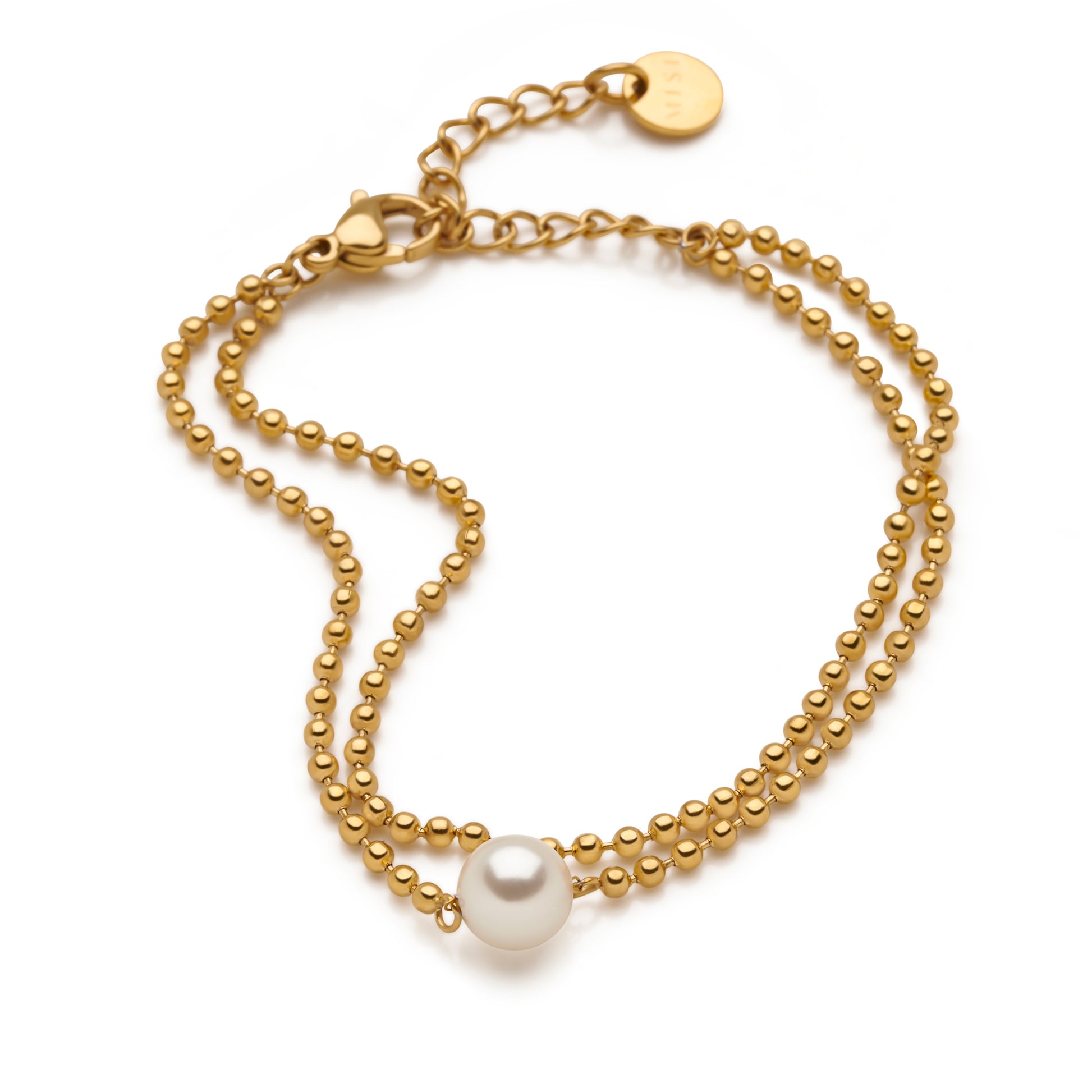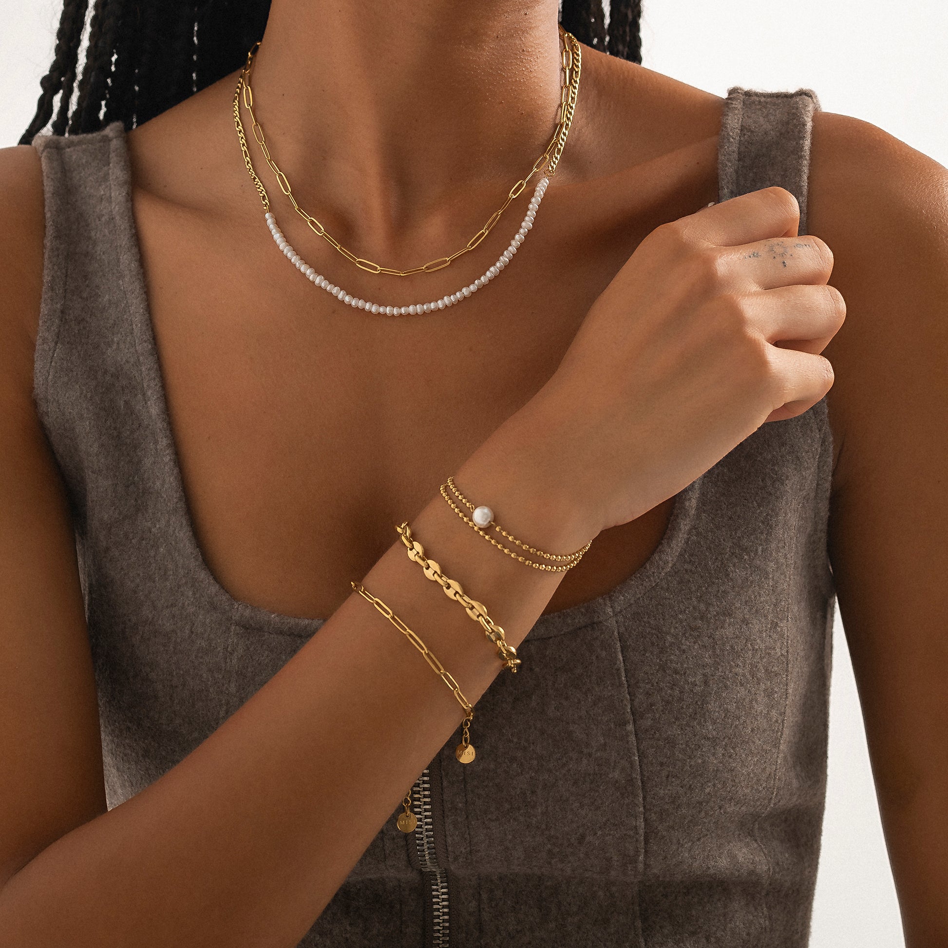 This 14k gold plated stainless steel ball bracelet features a modern double-strand design that balances elegance and edge. One strand showcases sleek gold-toned beads, while the other highlights a single white faux pearl at its center, adding a touch of softness and sophistication.