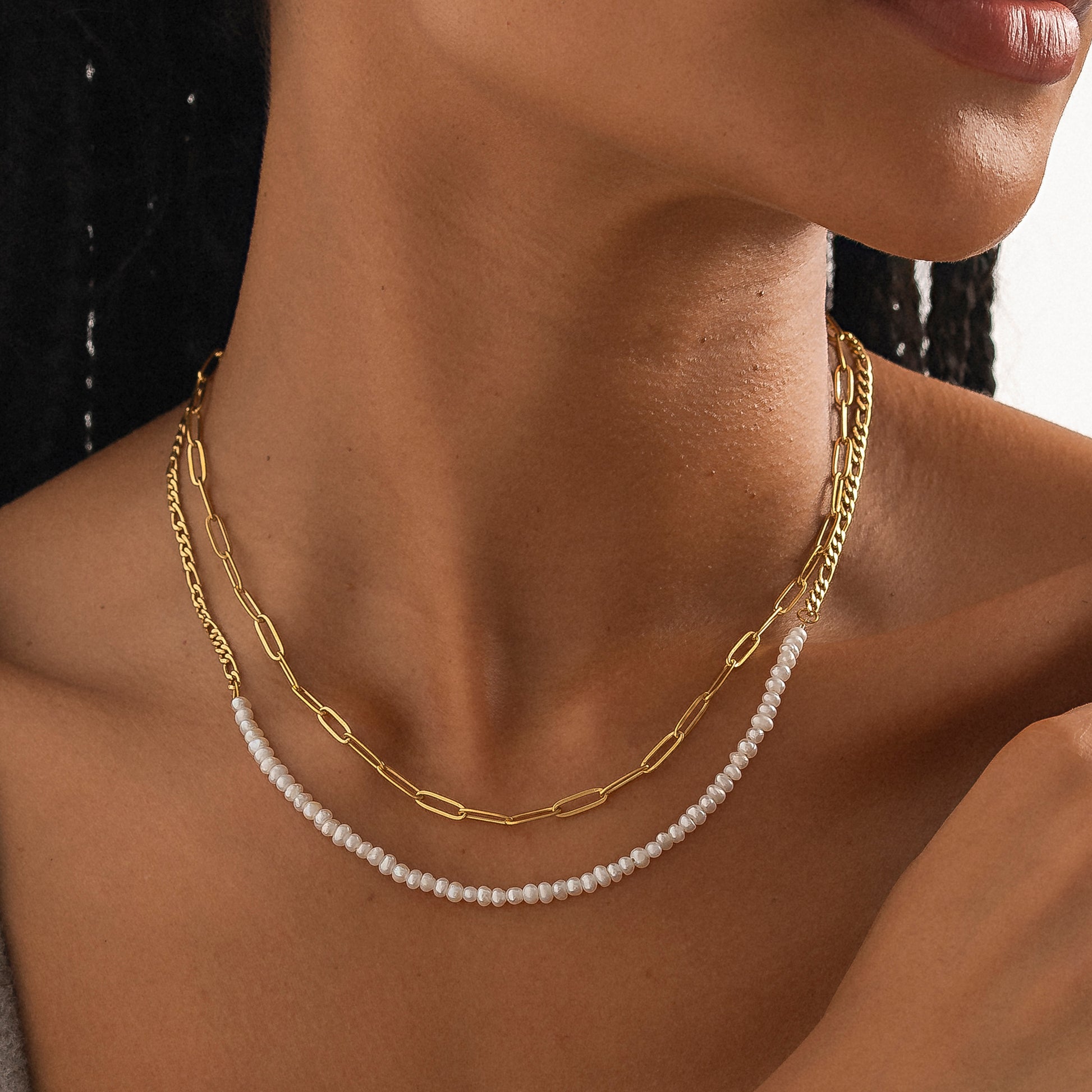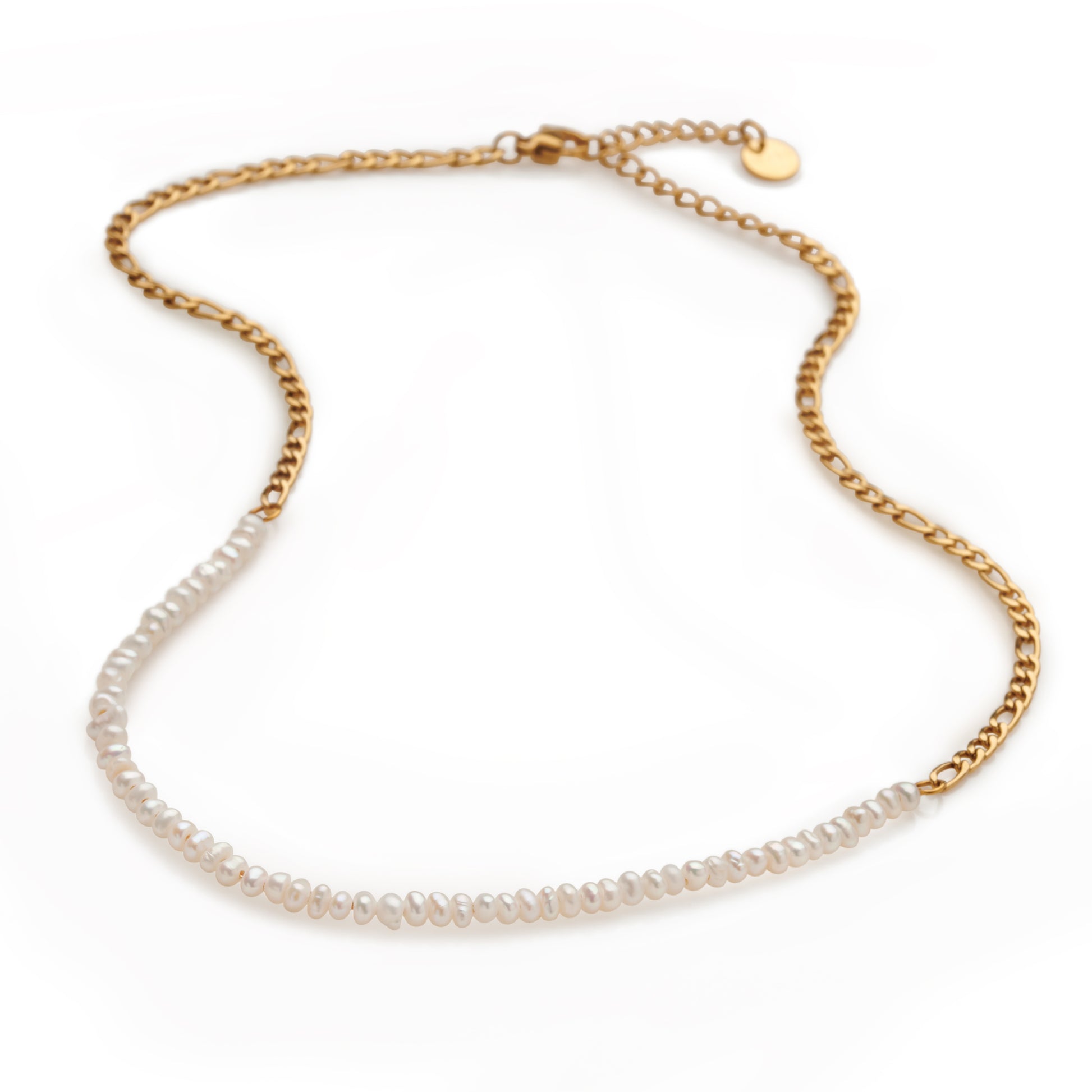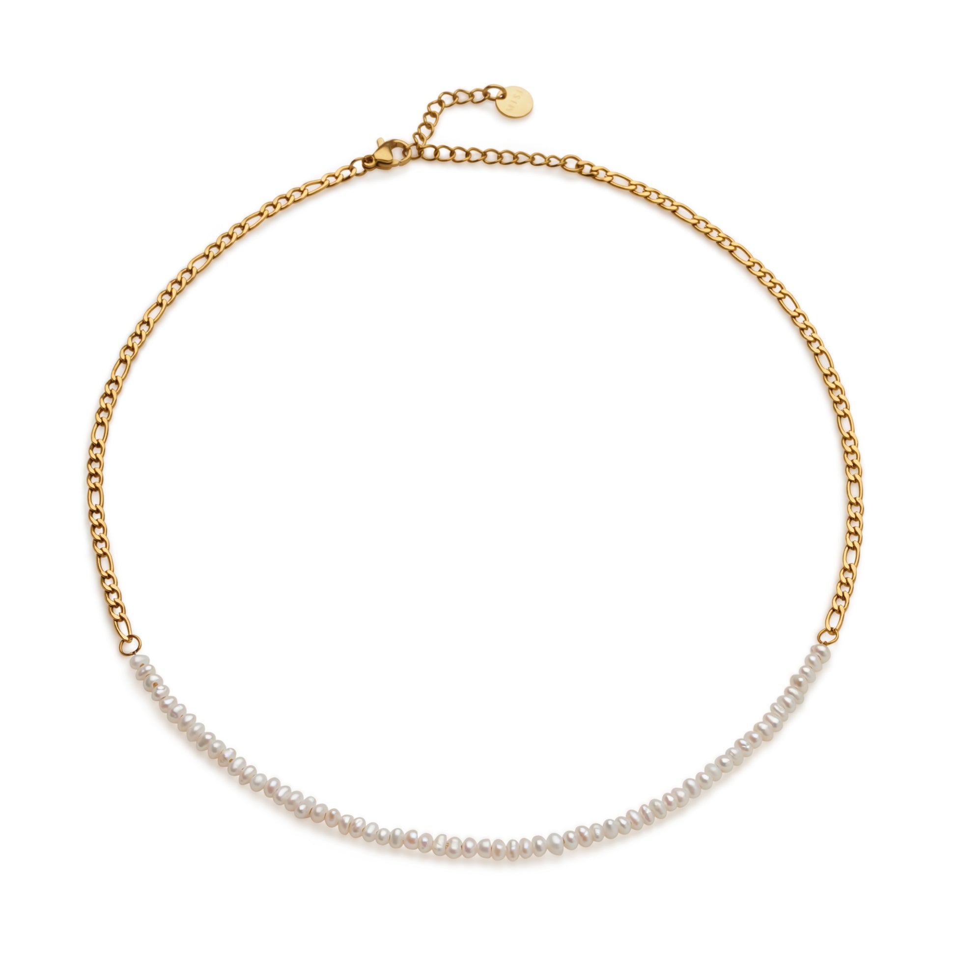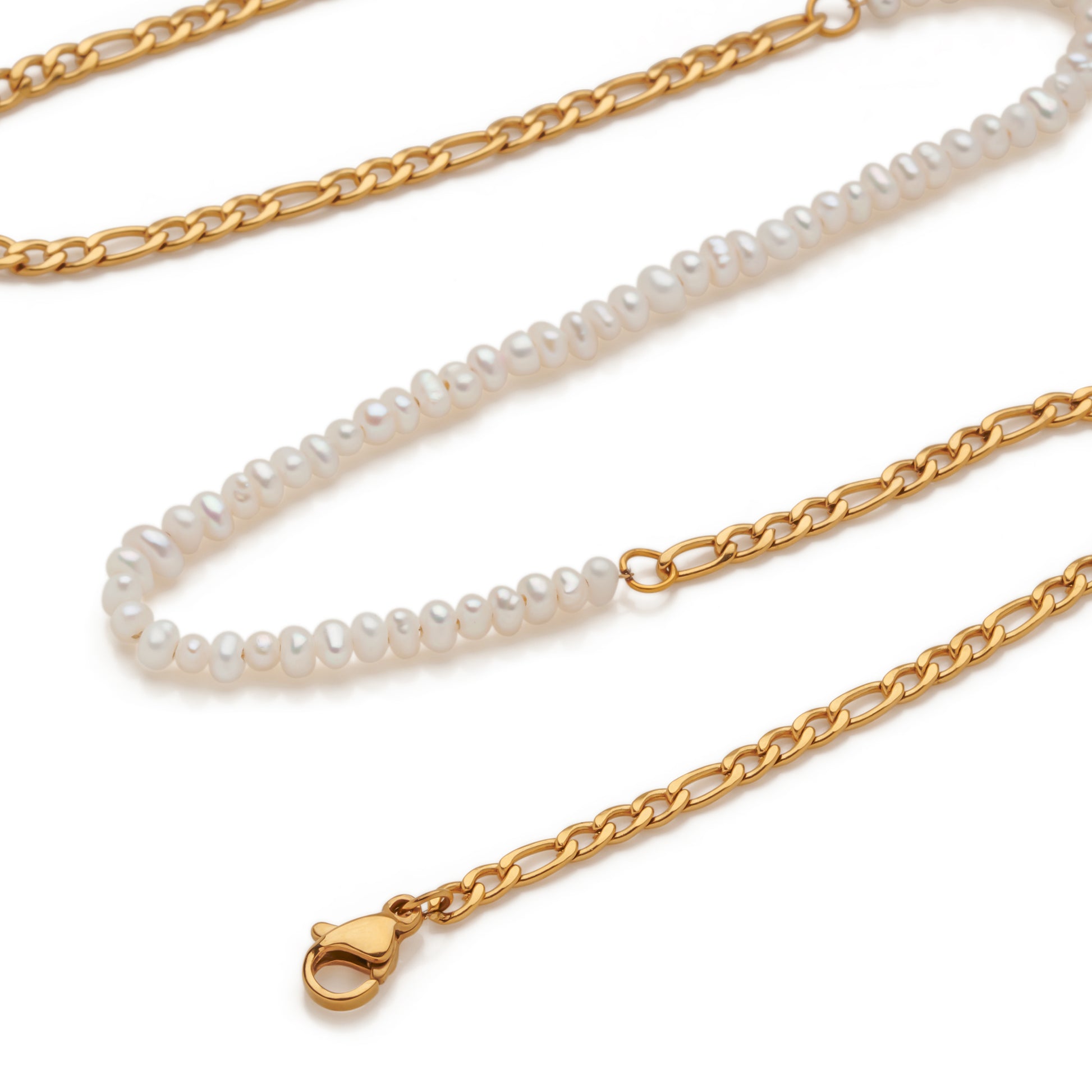 Upgrade your everyday with a bold twist on classic elegance. This 14k gold-plated stainless steel Figaro chain features a striking center of luminous mini white pearls, a refined contrast of edge and grace. The warm gold tone and polished links offer lasting shine and durability, while the delicate pearls bring softness and sophistication.