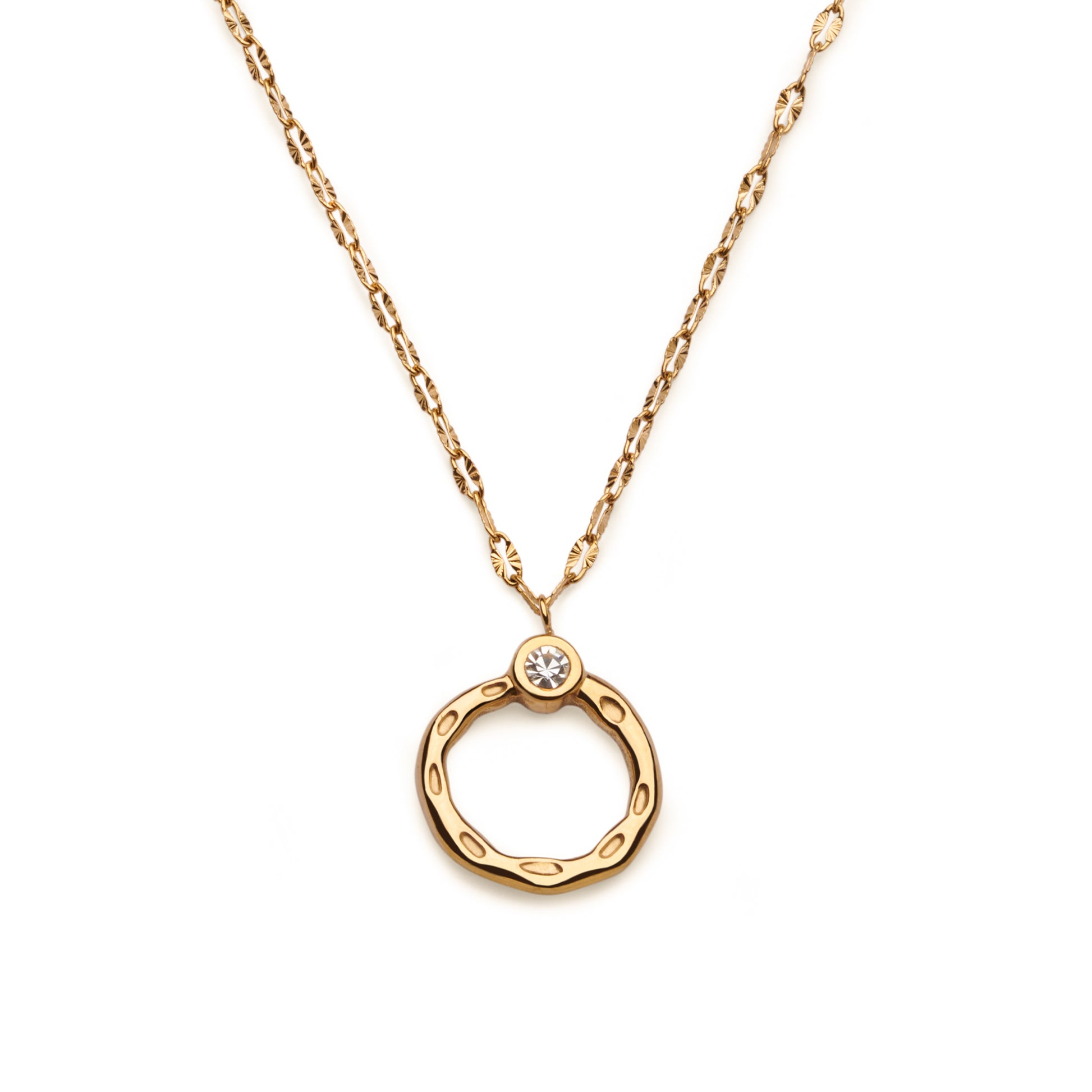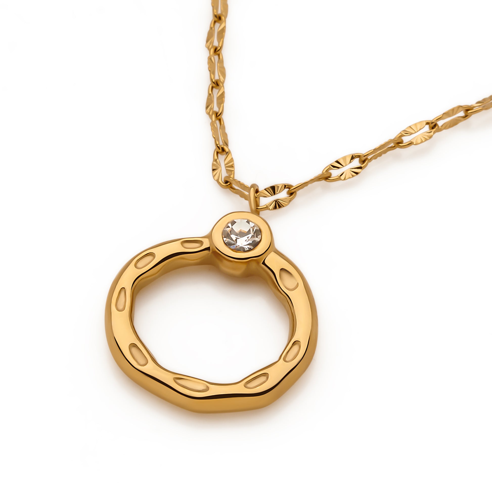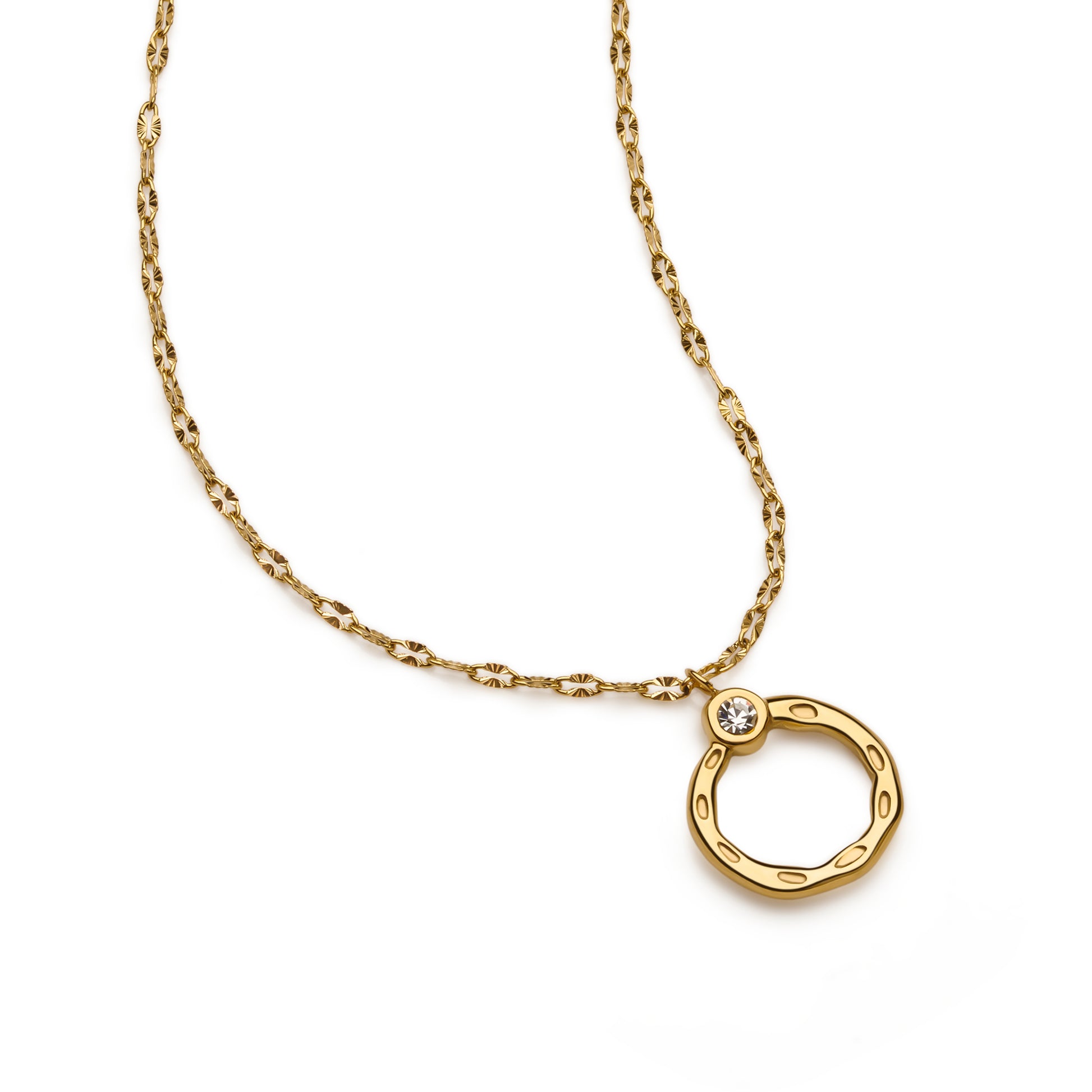 Radiate brilliance with every movement. This 14k gold-plated stainless steel chain features a unique twisted chain with grooved links which catch the light from every angle, creating a sleek, high-shine finish. At its center, a sculpted halo pendant adds bold dimension, crowned with a sparkling glass stone for just the right touch of shimmer.