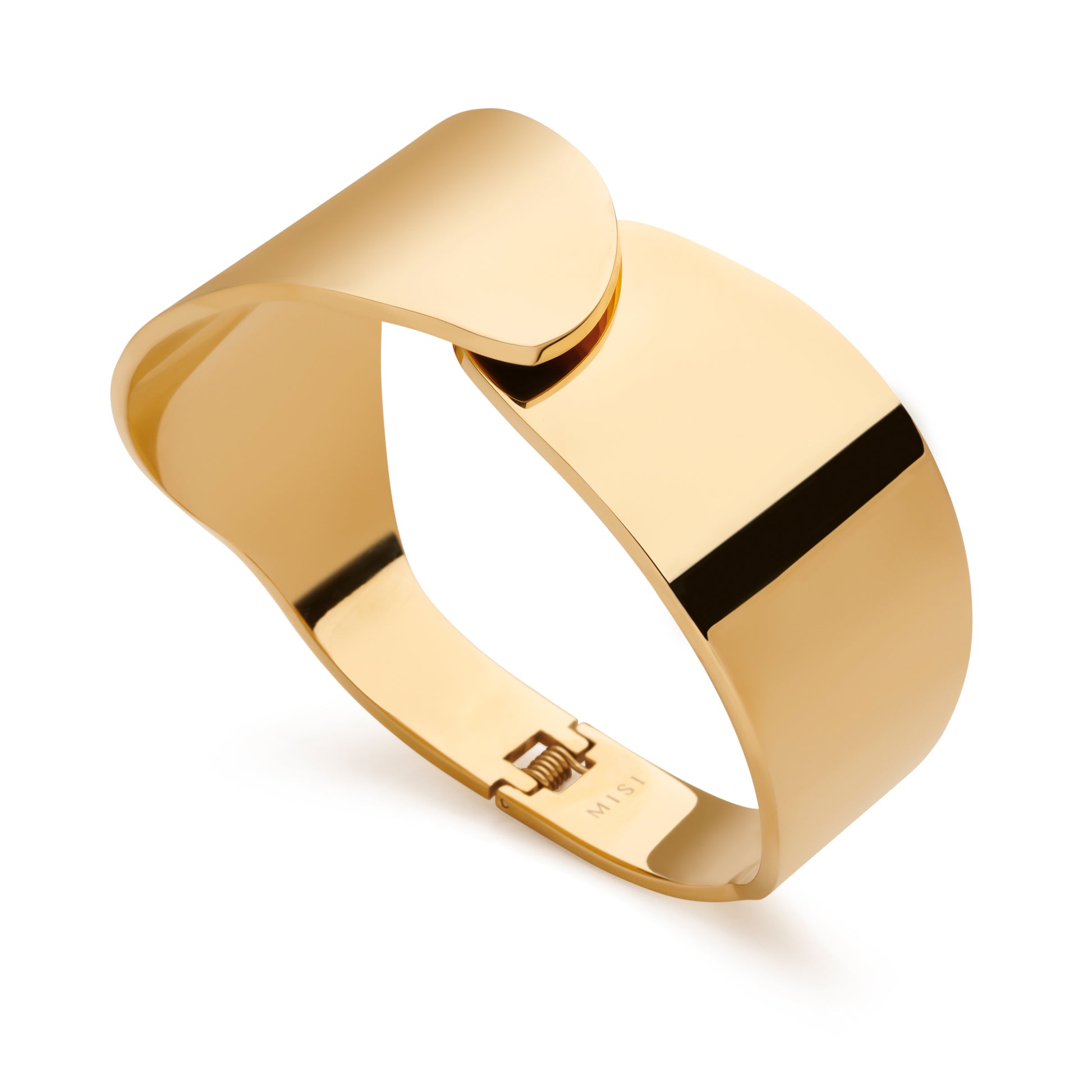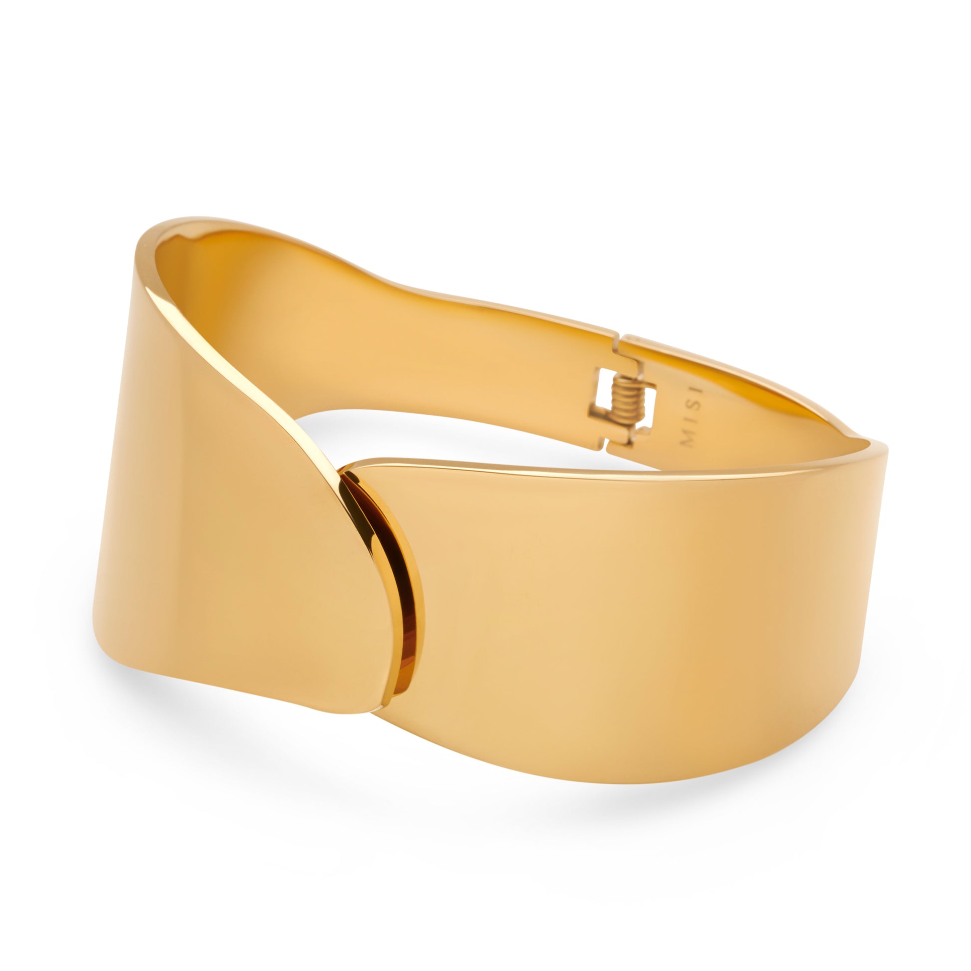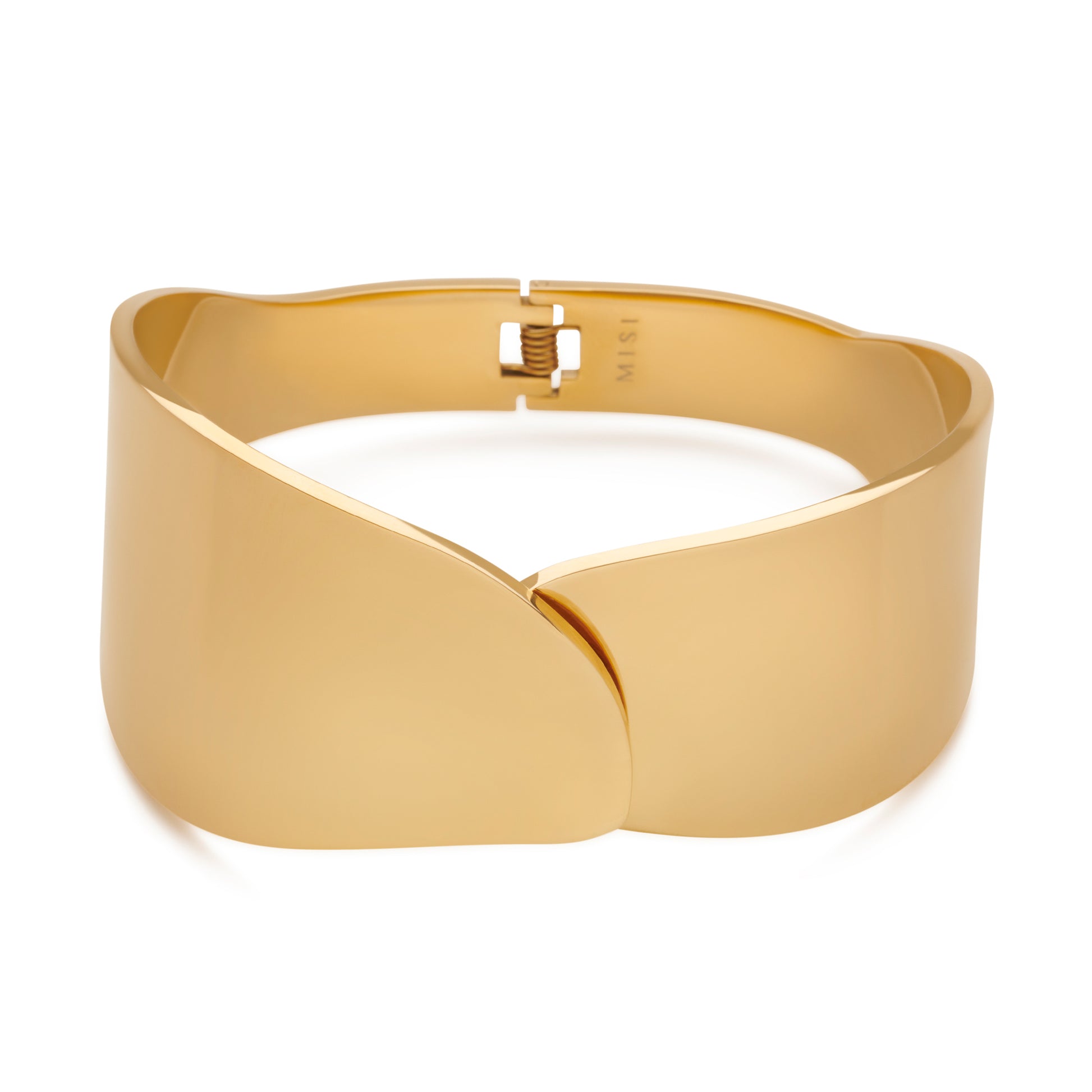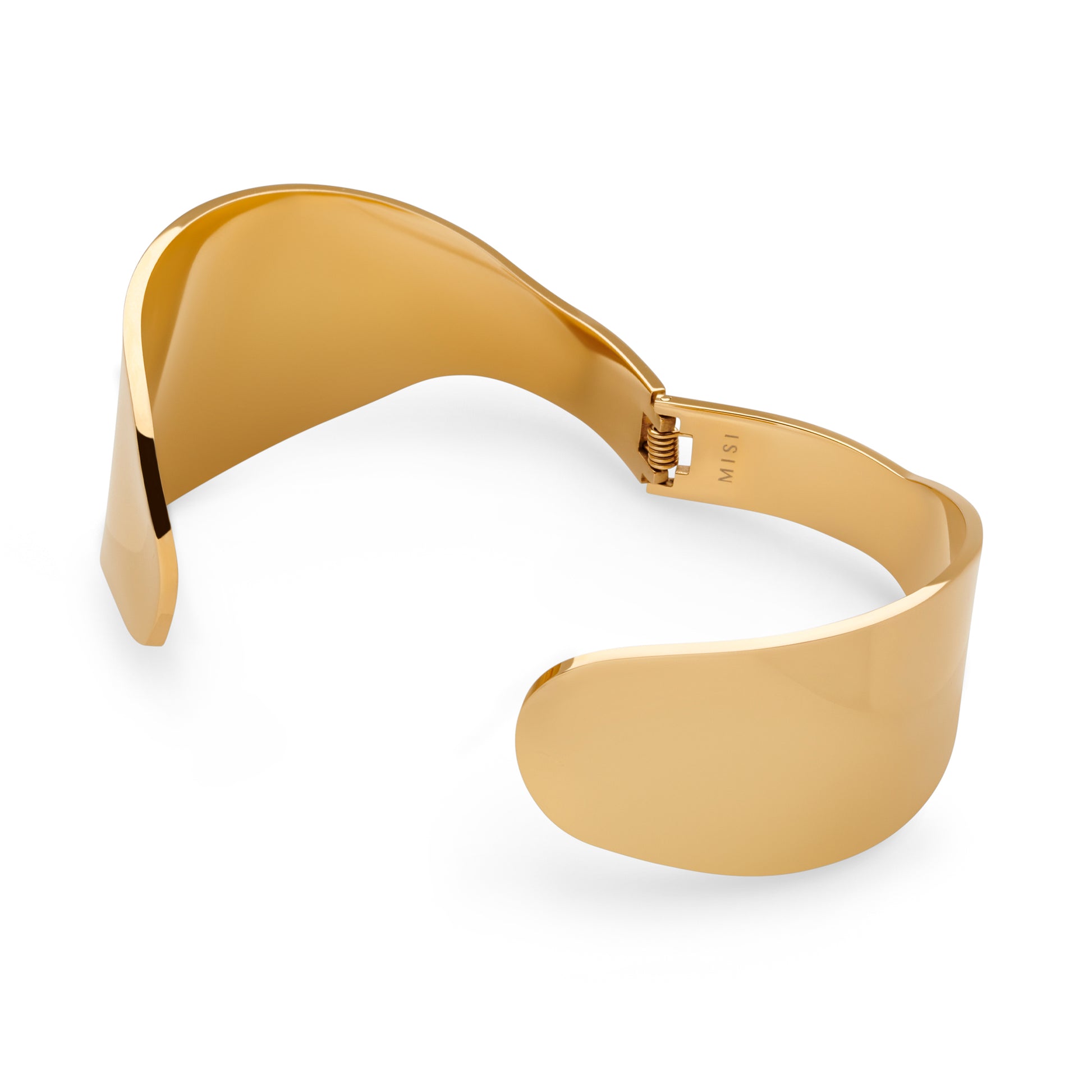 Make a powerful style statement with this oversized cuff bangle, crafted from 14k gold-plated stainless steel and finished with a high-polished surface for a mirror-like shine. The bold, minimalist silhouette wraps the wrist with modern elegance, while the discreet hinge closure allows for easy on-and-off wear without compromising comfort or style.