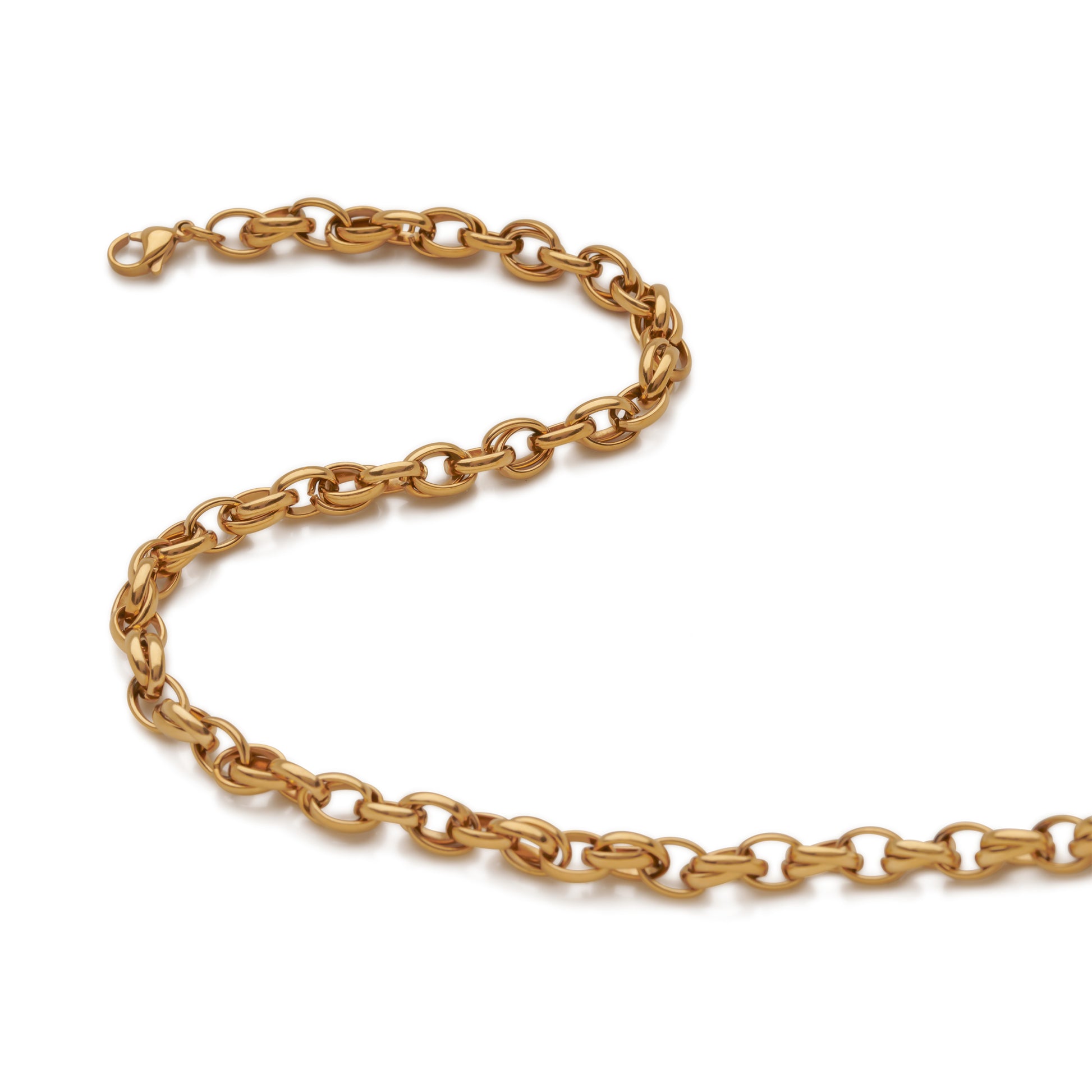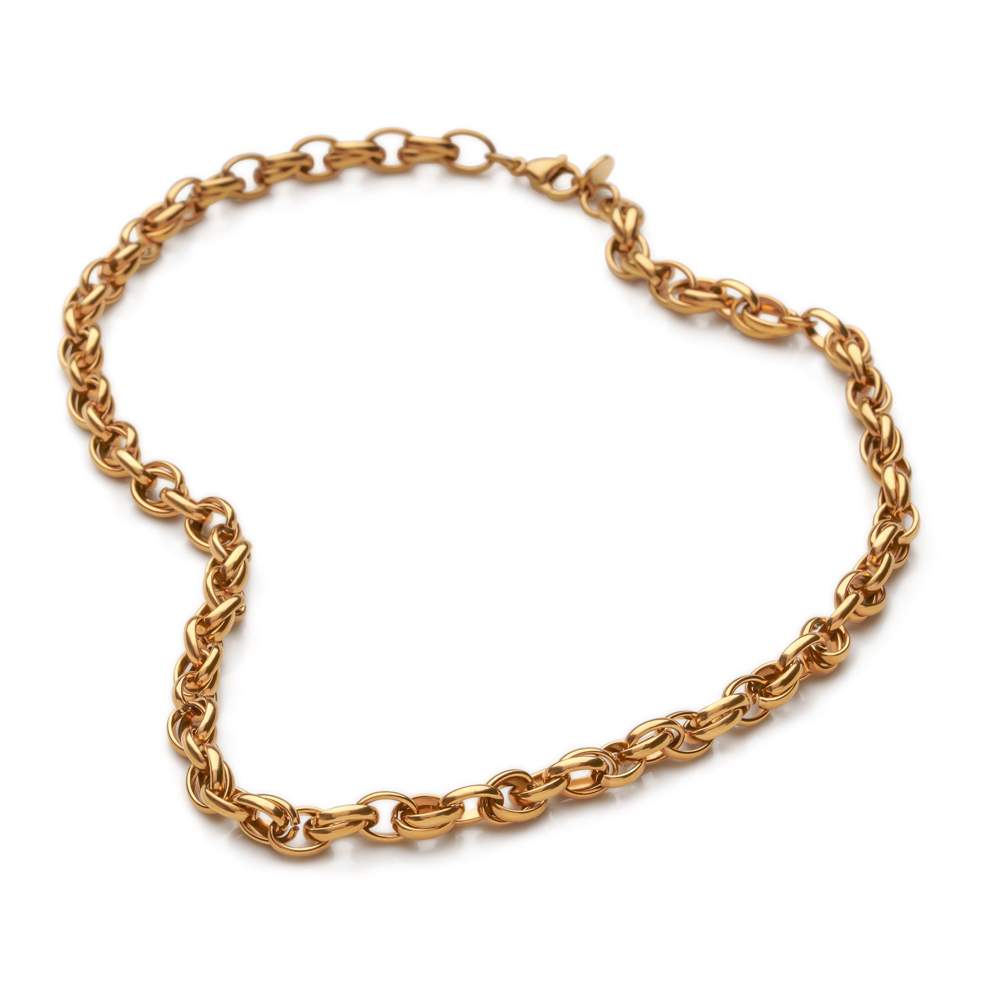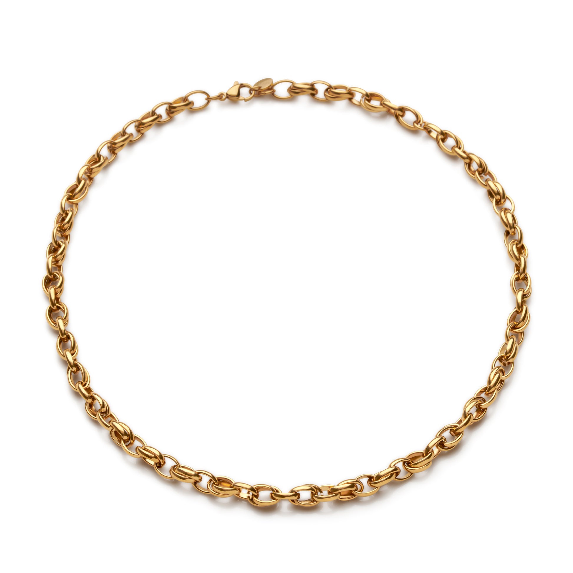 Make a statement of elegance with this stunning 14k gold-plated stainless steel necklace, featuring intricate interlocking links that create a dynamic, textured design. The carefully crafted links catch the light from every angle, adding depth and sophistication to your look. The luxurious gold plating ensures a radiant, timeless finish, while the durable stainless steel guarantees strength and longevity. Finished with a secure lobster clasp, this necklace offers both style and practicality, making it the perfect addition to elevate any outfit for both everyday wear and special occasions.