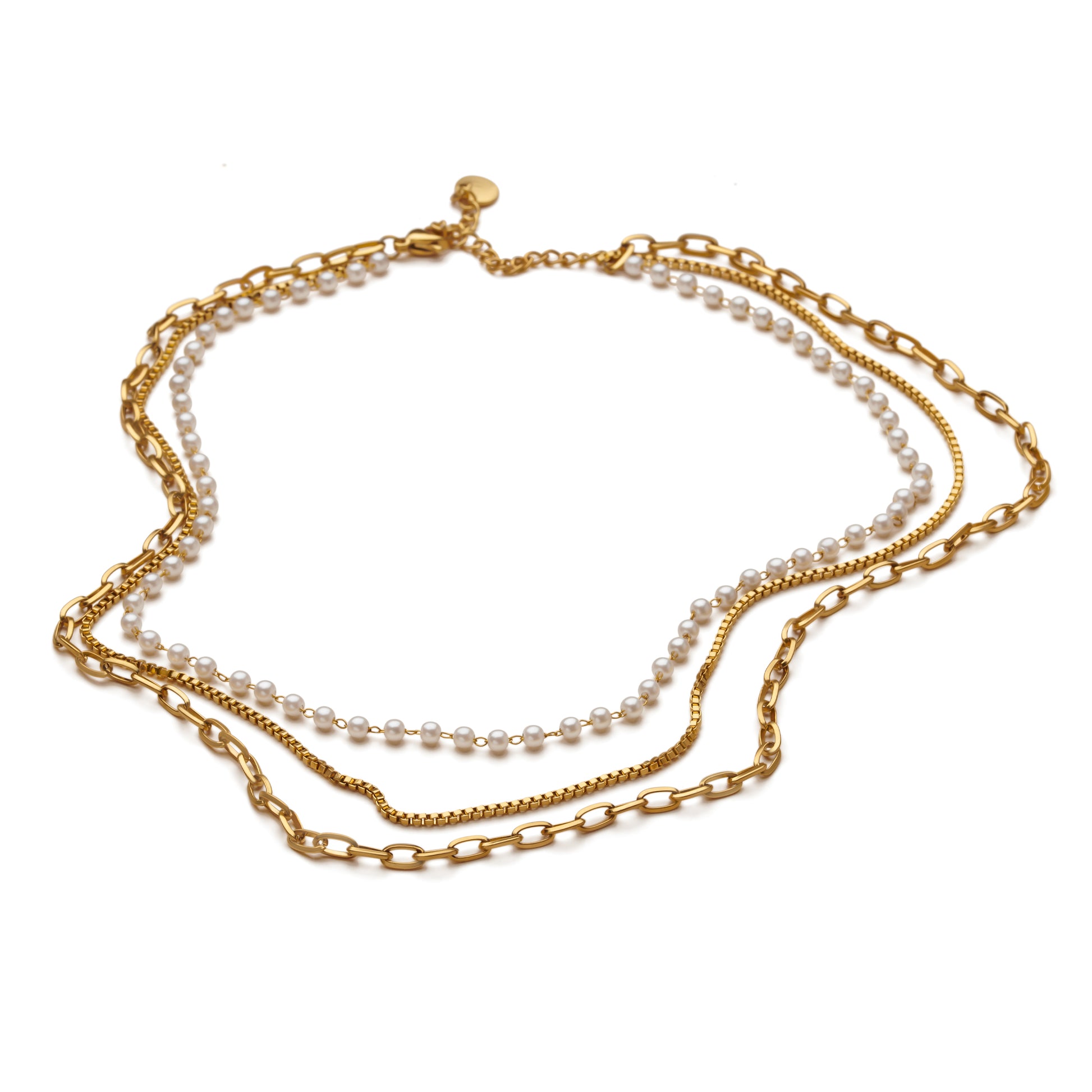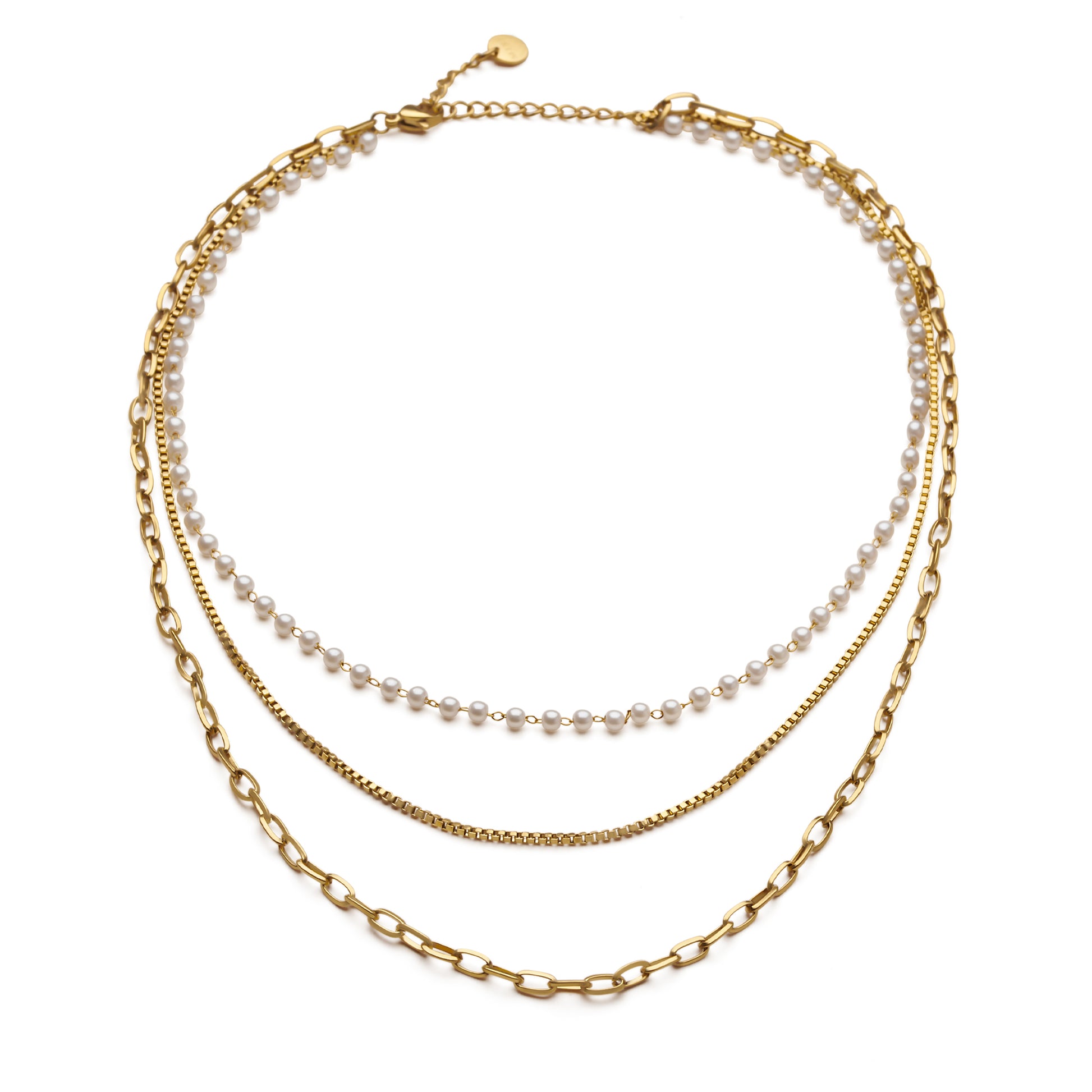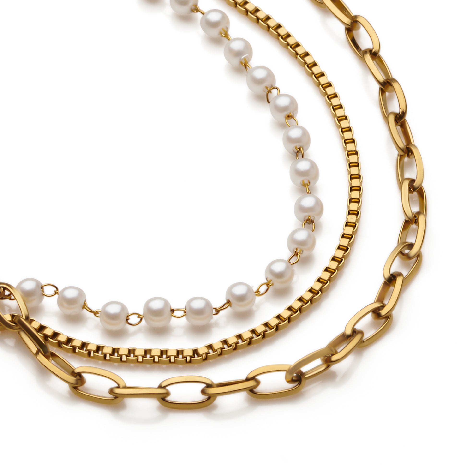 Upgrade your style with this beautifully layered necklace, crafted in durable 14k gold-plated stainless steel for lasting shine and everyday wear. Featuring three distinct strands; a sleek box chain, a bold oval link chain, and a strand of faux white pearls. This piece delivers a perfectly styled layered look in one easy-to-wear design.