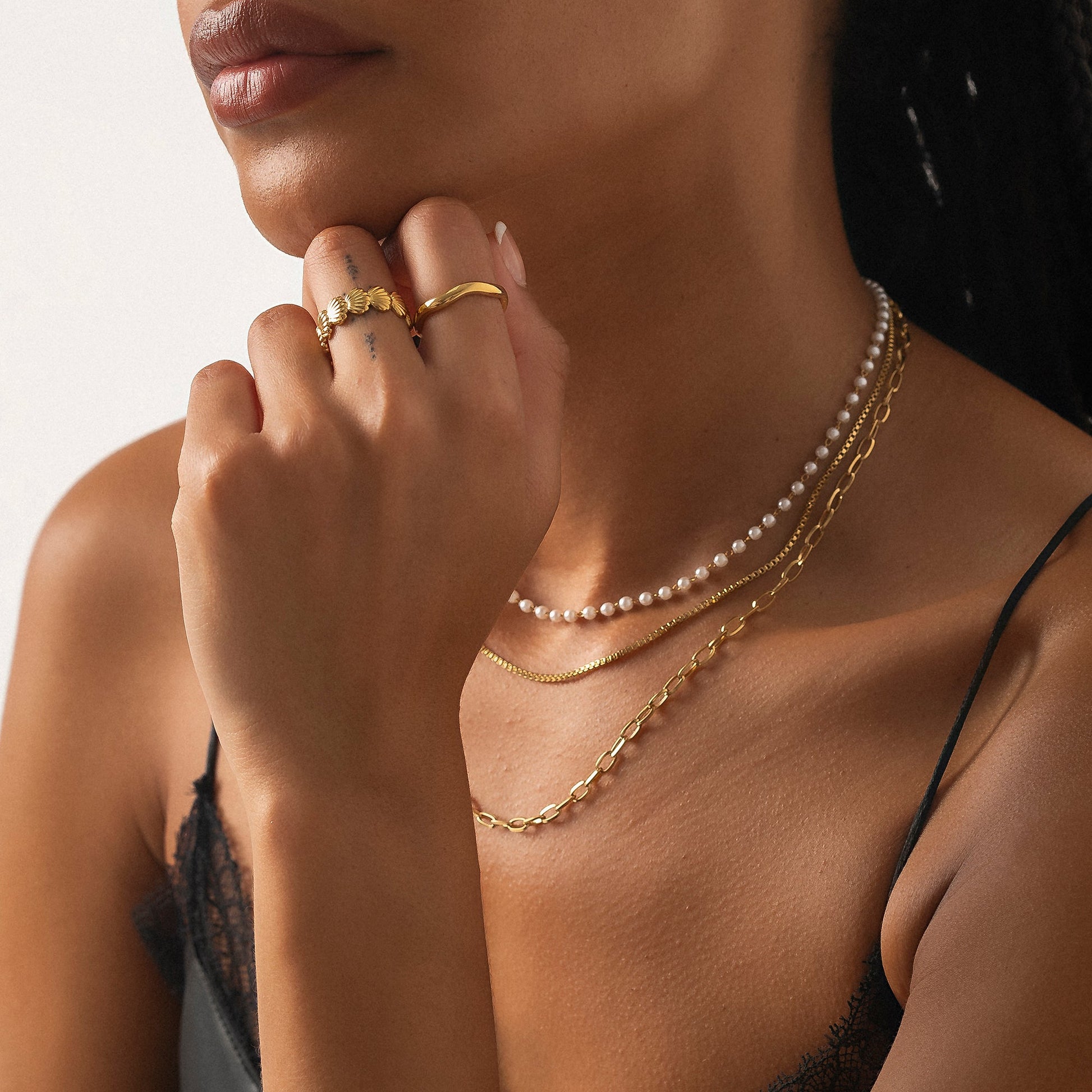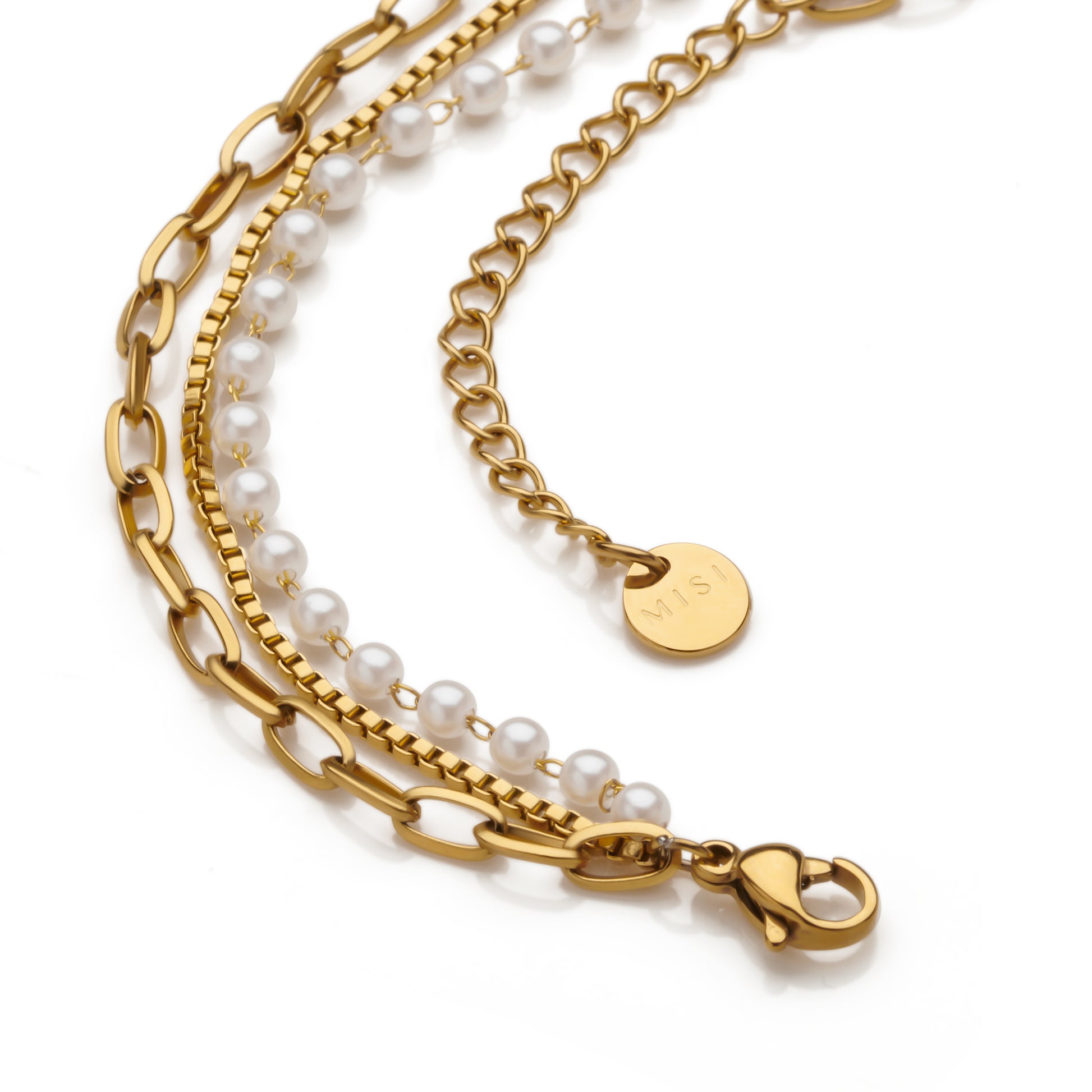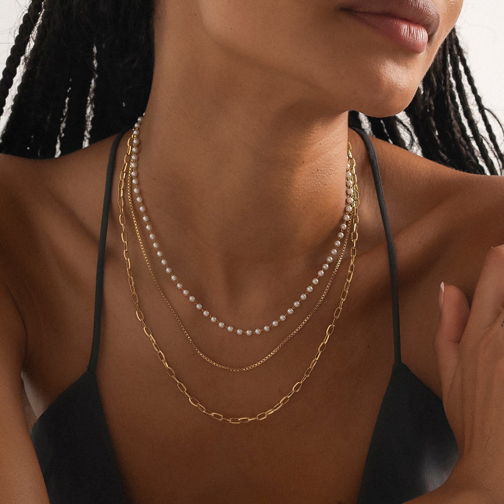 Upgrade your style with this beautifully layered necklace, crafted in durable 14k gold-plated stainless steel for lasting shine and everyday wear. Featuring three distinct strands; a sleek box chain, a bold oval link chain, and a strand of faux white pearls. This piece delivers a perfectly styled layered look in one easy-to-wear design.