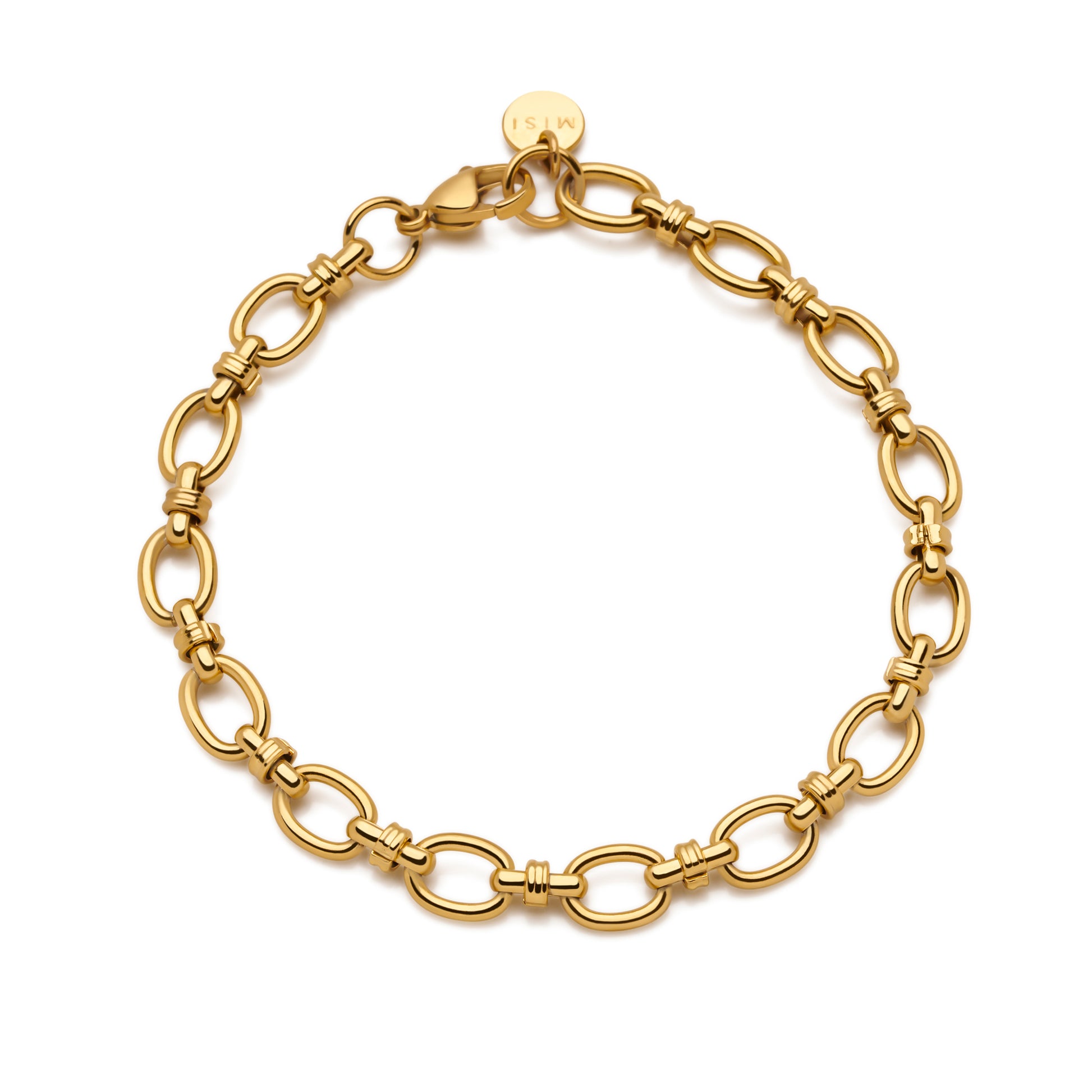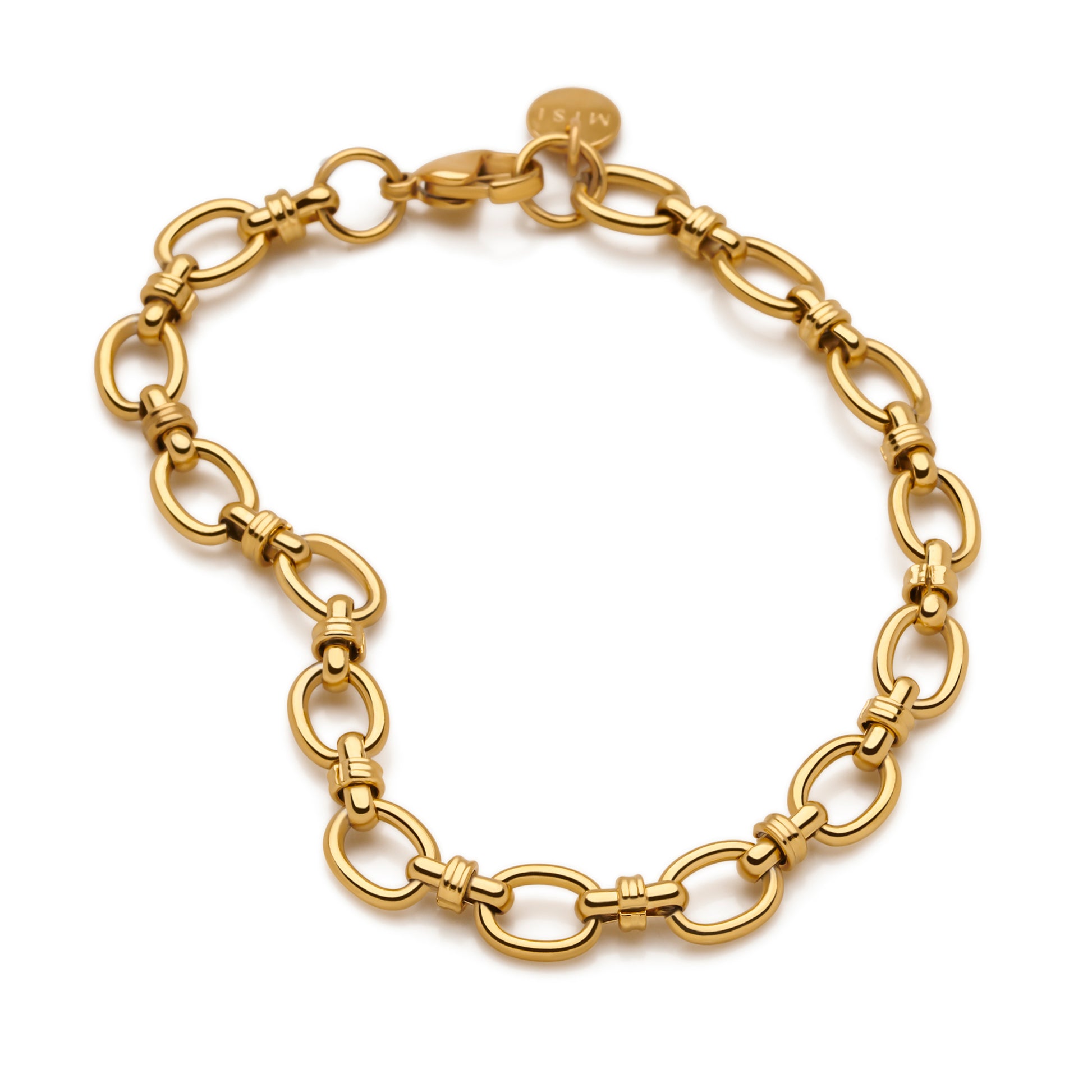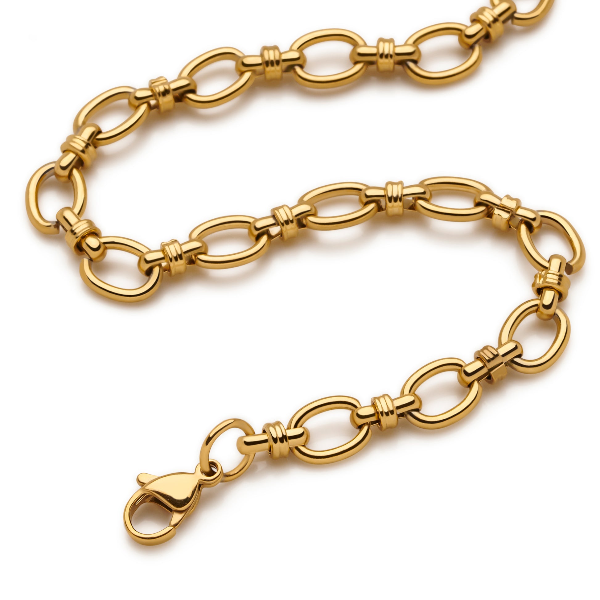 Elevate your everyday look with this 14k gold-plated stainless steel bracelet, featuring wide oval links that blend bold design with modern sophistication. Crafted for durability and lasting shine, the bracelet is finished with a secure lobster clasp for easy, reliable wear.