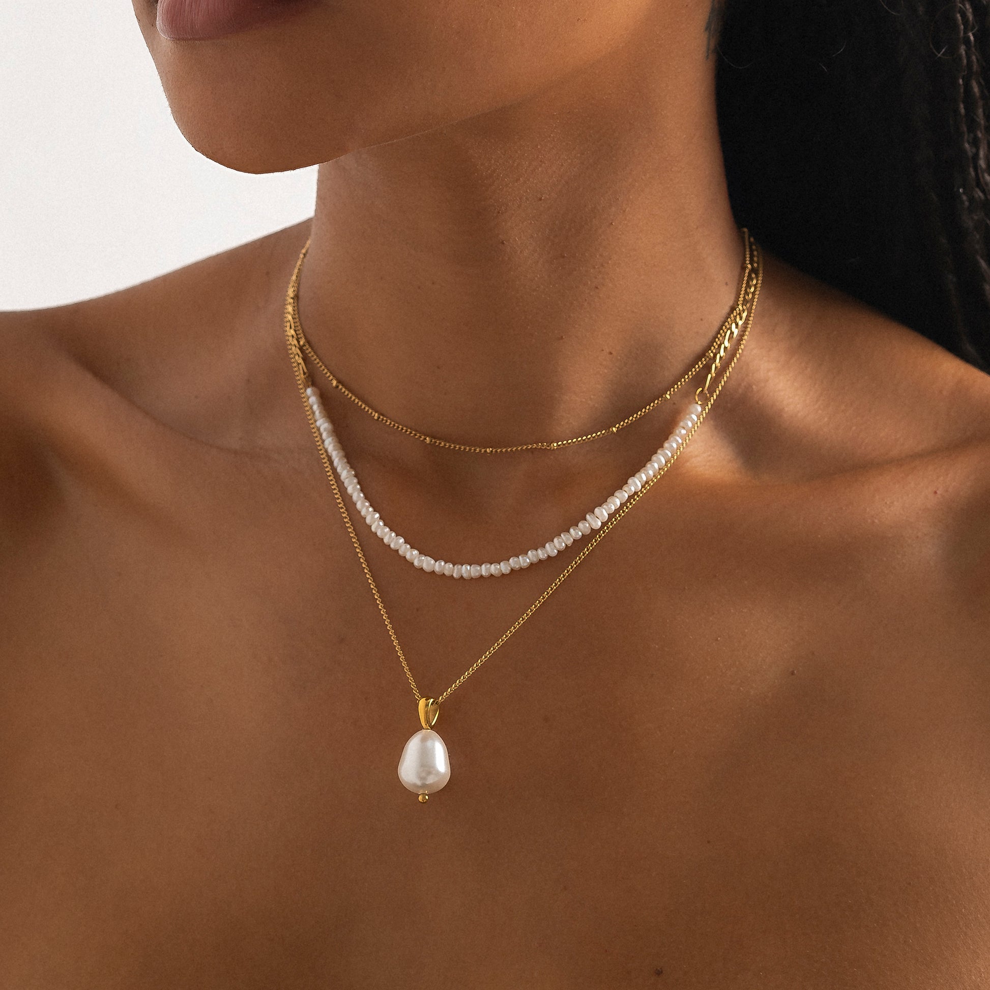 Timeless elegance meets a modern classic in this delicate 14K gold plated curb chain necklace. Crafted from durable stainless steel and finished with a warm, lustrous gold plating, the fine chain offers a subtle shimmer that beautifully complements its bold centerpiece... an oversized white faux pearl pendant. Designed to make a statement while remaining effortlessly wearable, this piece is perfect for layering or wearing solo for a refined, sophisticated look.