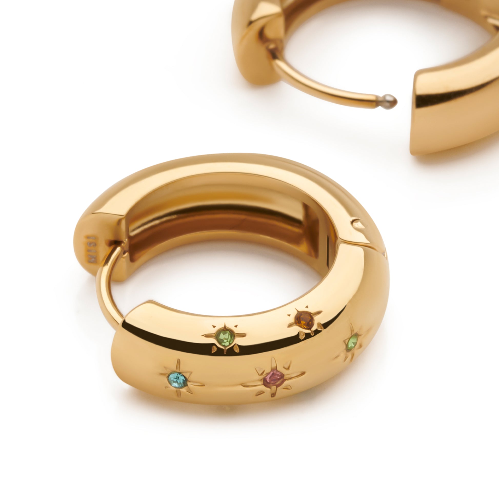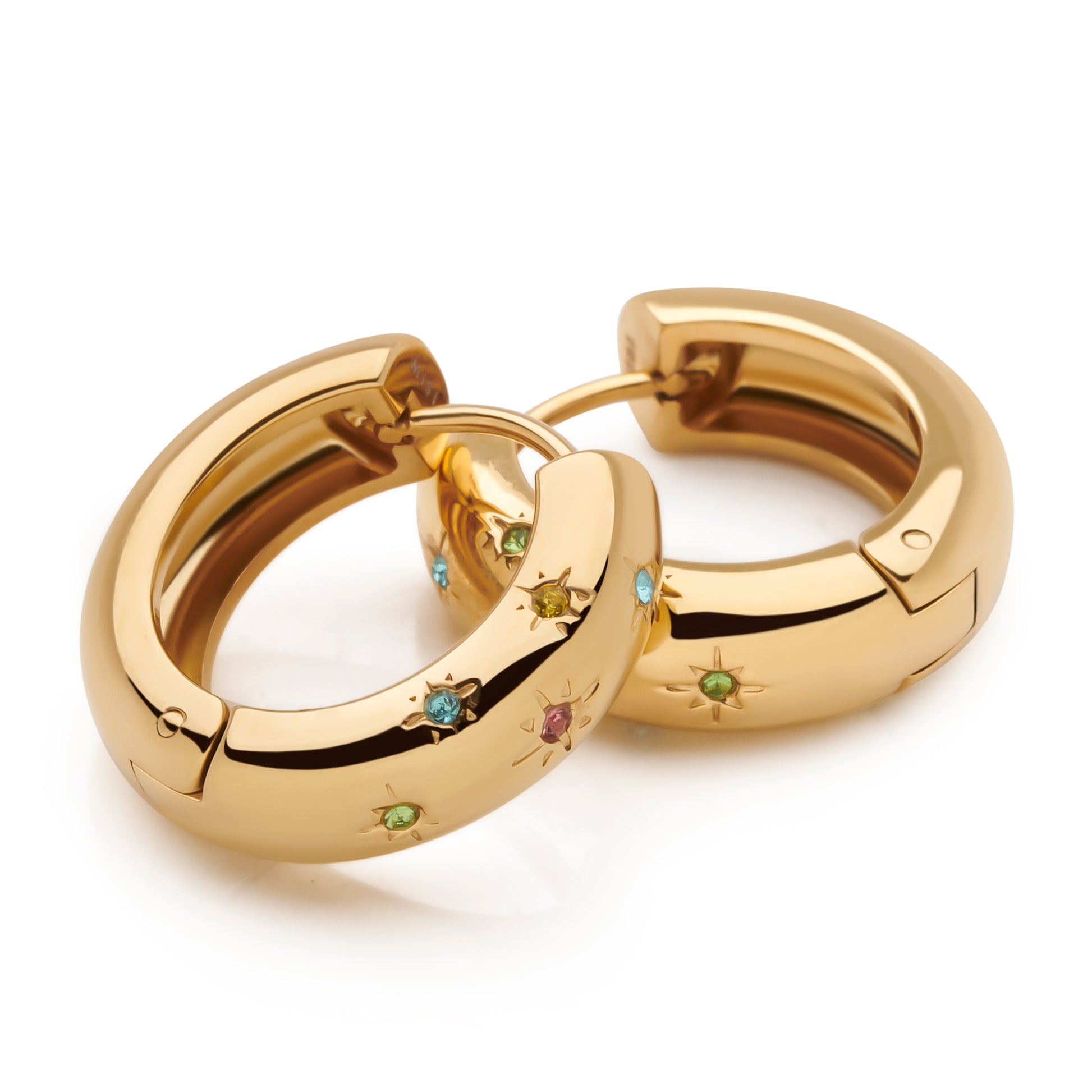 Make a statement with these eye-catching 14K gold plated hoop earrings, crafted from durable stainless steel for lasting shine and everyday wearability. Featuring a sleek hinged closure for a secure, comfortable fit, each hoop is adorned with embossed stones in a playful palette of blue, yellow, pink, green, and brown. The colorful detailing adds a fun, artistic twist to the classic hoop silhouette, perfect for brightening up your everyday look or completing a bold ensemble.