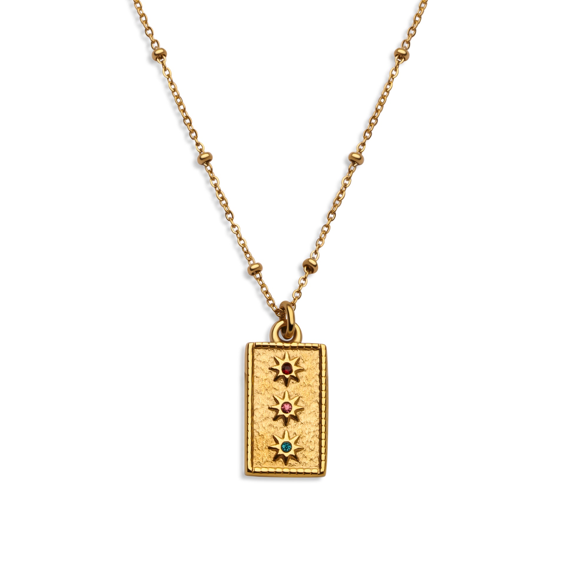 Add a touch of color and class to your jewellery collection with this 14K gold plated necklace, crafted from durable stainless steel for long-lasting shine. The delicate chain features subtle bead intervals for added texture and elegance, perfectly complementing the refined pendant adorned with pink, red, and blue stone accents. Whether worn alone or layered, this piece brings a polished, feminine charm to any outfit.