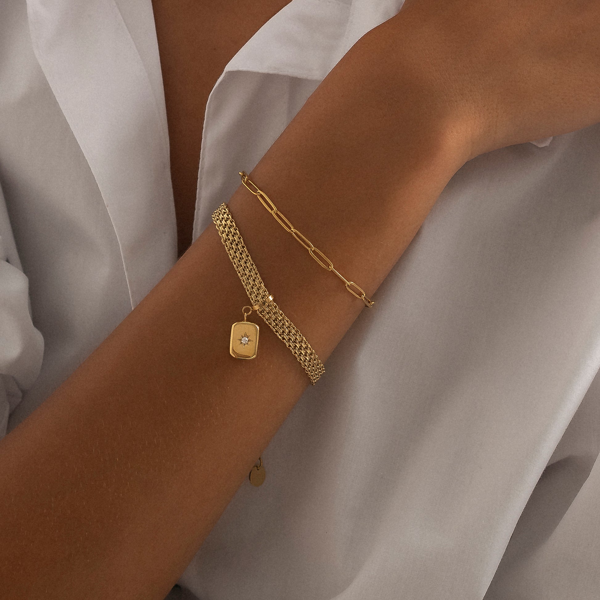 Sleek texture meets sparkling detail in this eye-catching 14k gold-plated stainless steel mesh chain bracelet, featuring a dazzling rhinestone charm for just the right amount of shine. The finely woven mesh design adds a modern edge, while the rhinestone stud charm brings a touch of effortless glamour.